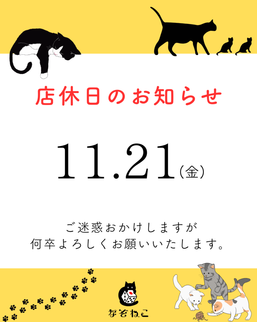2025.11.14 未分類 11月21日(金)の店休日のお知らせ nazoneko 平素は格別のご愛顧を賜り、厚く御礼申し上げます。 11月21日(金)は誠に勝手ながら、店休日とさせていただきます。 お客様には大変ご迷惑をお掛けいたしますが、 ご理解の程よろしくお願い申し上げます。 ABOUT ME 謎解きカフェ&ボードゲームなぞねこXInstagramYouTubeContact名古屋市黒川にあるカフェ謎・ボードゲーム・マーダーミステリーが遊べるお店! 名古屋市営地下鉄名城線「黒川駅」4番出口から徒歩5分!