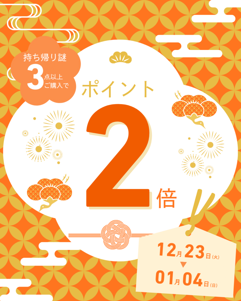持ち帰り謎を3点以上ご購入いただくと、当日中のポイントを2倍で付与します!